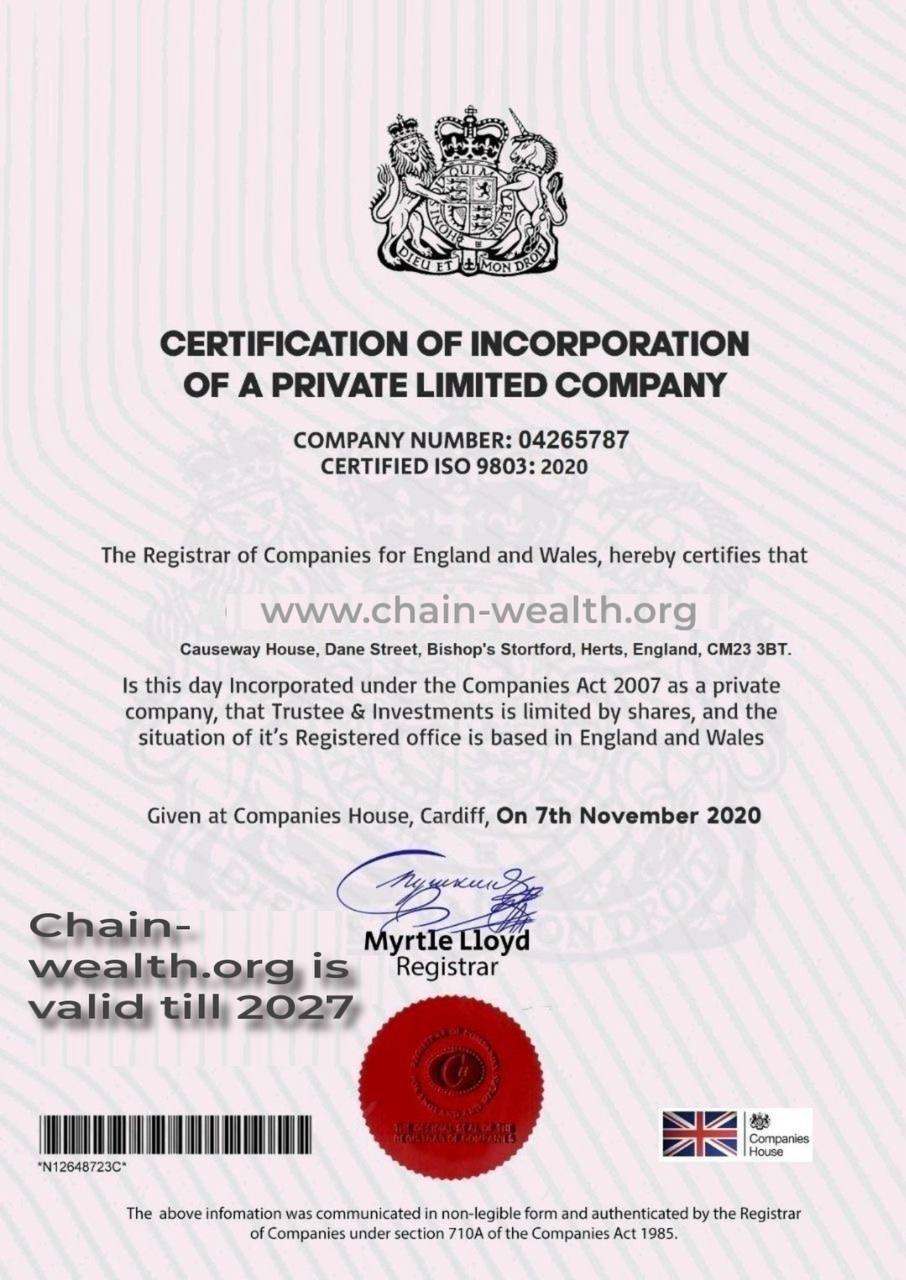 Certificate of Incorporation for Private Companies This serves as the Chain Wealth Regulatory Certification, representing our commitment to transparency, integrity, and trust as you engage with our platform.